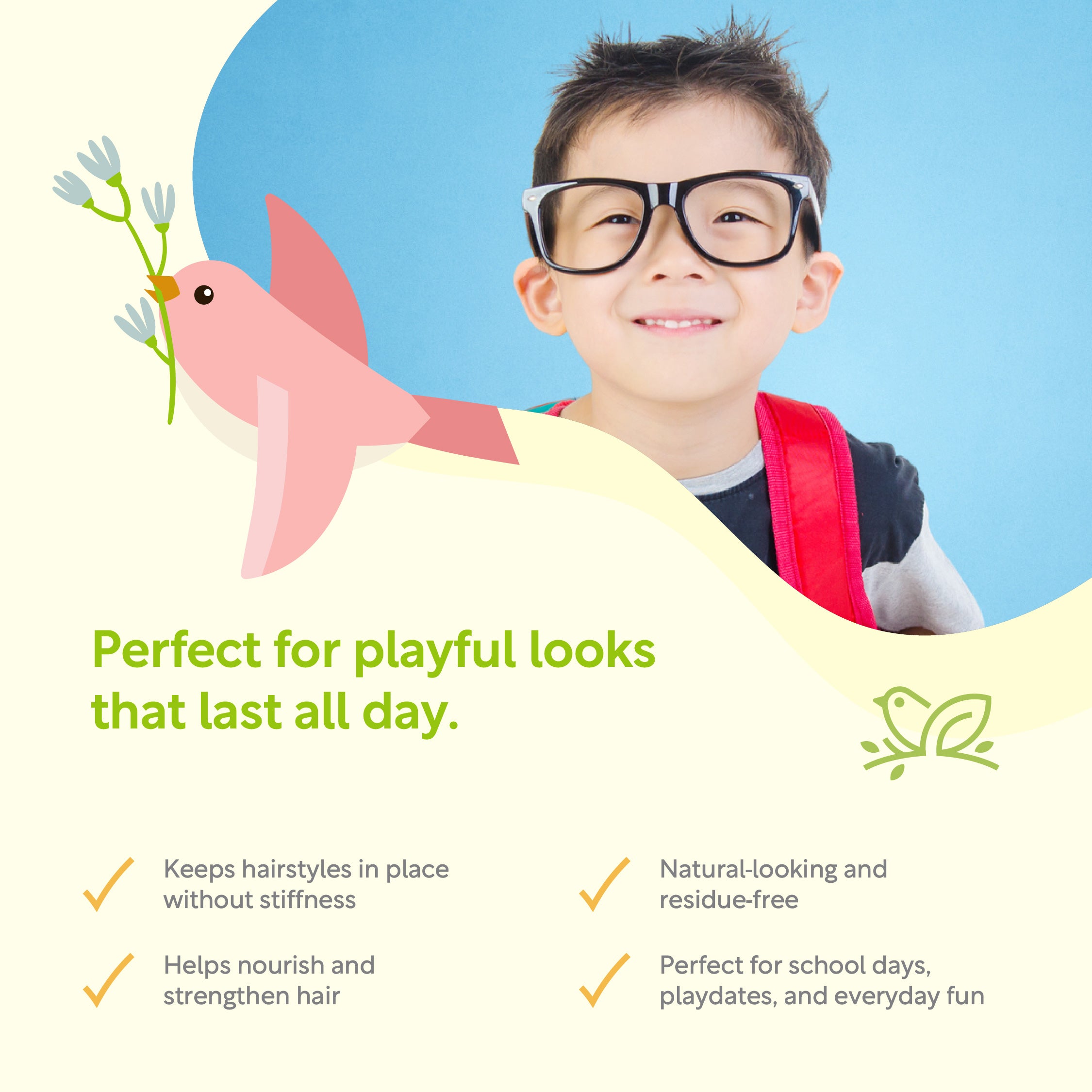 Infused with aloe vera that helps nourish and strengthen hair, while holding style in place. No crunch, no flakes. Perfect for playful looks that last all day. Gentle and easy to wash out. Great for school days, playdates, and everything in between!