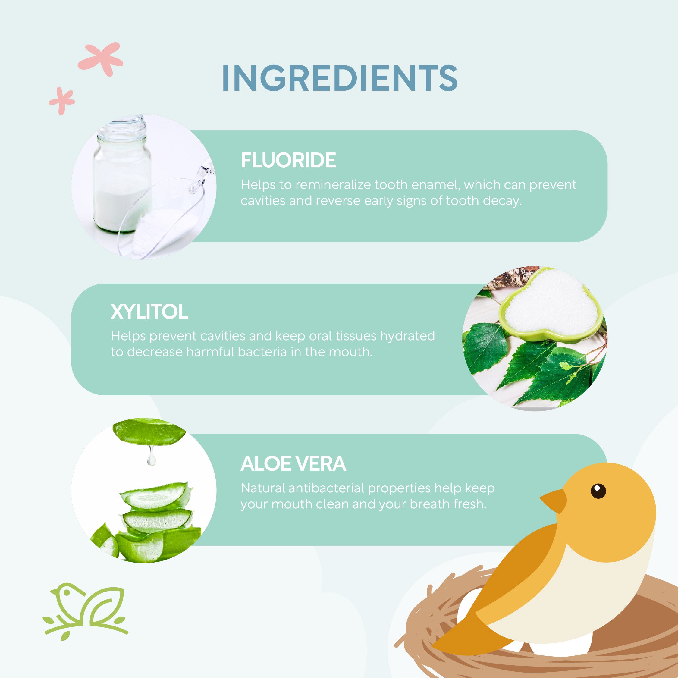 Sorbitol, Water, Hydrated Silica, Xylitol, Xanthan Gum, Sodium Fluoride, Aloe Vera Extract (leaves of Aloe barbadensis), Sunflower Oil (seeds of Helianthus annuus)